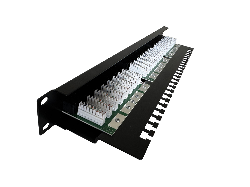Připojovací plně osazený patch panel značky Adex v provedení CAT5e UTP s vyvazovací lištou. Pro připojení je k dispozici 24 portů RJ45, pro montáž do 19" rozvaděče. Montáž kabeláže se provádí pomocí zářezových svorkovnic a zadního vyvazovacího panelu.
