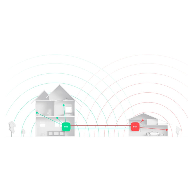 ReX 2 je rozšiřovač dosahu rádiového signálu, který zprostředkovává komunikaci mezi centrálním ovládacím panelem a připojenými zařízeními, a díky tomu je umožňuje umístit téměř ve dvojnásobné vzdálenosti od sebe. S jeho pomocí je tak možné systémem Ajax zabezpečit několikapodlažní budovy a další rozsáhlé objekty. Použití 5 těchto zařízení rozšiřuje pokrytí rádiového signálu až na 35 km2.