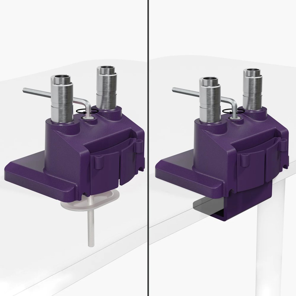 Držák nabízí dva způsoby upevnění ke stolu - pomocí C-svorky nebo průchodky. Obě montážní sady jsou součástí balení, takže můžete zvolit řešení, které nejlépe vyhovuje vašemu pracovnímu stolu.