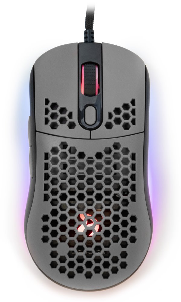 Ultralehká herní myš disponující 7 programovatelnými tlačítky a vysoce přesným optickým senzorem Pixart 3389 s rozlišením až 16000 DPI. Kryt v designu plástve snižuje celkovou hmotnost, zlepšuje odvod tepla, a tím zajistí i pevnější uchopení myši. Herní design poté doplňuje nastavitelné RGB podsvícení. Kvalitní spínače Omron vydrží více než 20 milionů kliknutí. Připojení je realizováno skrze opletený USB kabel.