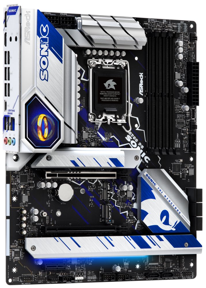 Základní deska ASRock Z790 PG SONIC s oficiální licencí modrého rychlíka ježka Sonica. Design se vyznačuje celou řadou prvků, které odkazují na tuto legendární postavu od SEGA. IO kryt desky je ozdoben typickým prstýnkem, nechybí ani zachycení Sonica uprostřed běhu. Kromě vzhledu má deska s touto herní ikonou společné také maximální rychlost.