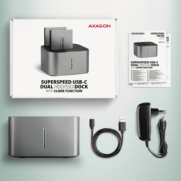 (Registrace)AXAGON ADSA-DC, USB-C 5Gbps - 2x SATA 6G 2.5"/3.5" SSD/HDD CLONE DUAL dokovací stanice