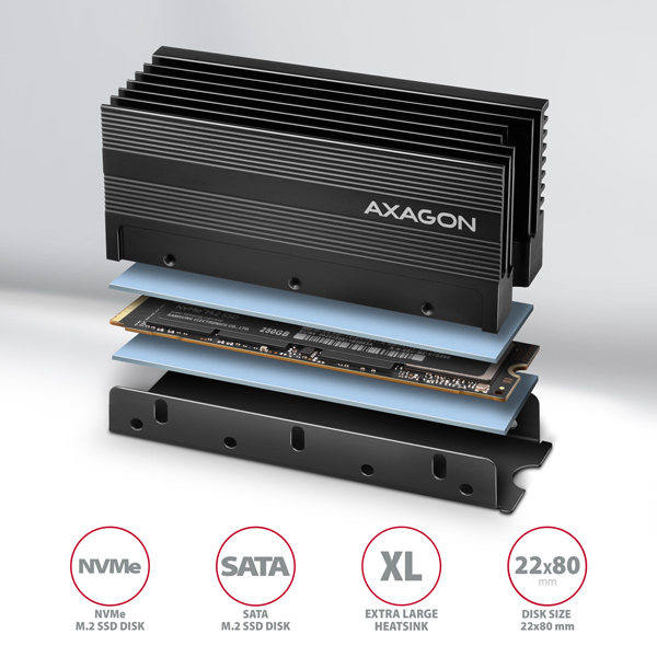 (Registrace)AXAGON CLR-M2XL, hliníkový pasivní chladič pro jedno i oboustranný M.2 SSD disk, výška 36 mm