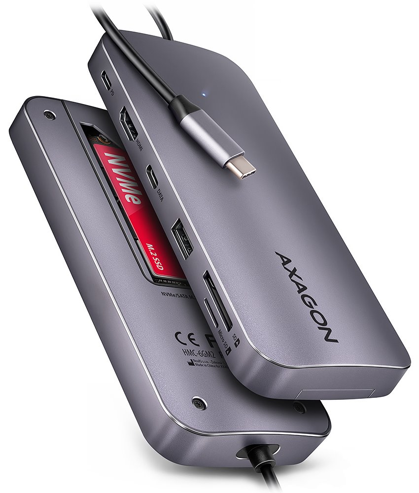 Multiportový USB-C 10Gbps hub AXAGON HMC-6GM2 GEN2COMBO 6in1 rozšíří Váš notebook, počítač nebo telefon o pět portů a externí box pro M.2 disk. Přes oboustranný USB-C konektor snadno a rychle připojíte k počítači dvě USB zařízení, čtečku SD karet, jeden monitor a NVMe nebo SATA M.2 SSD disk. Zároveň získáte možnost napájení notebooku pomocí technologie Power Delivery. USB-C hub vám tak poskytne jednoduchou a skladnou dokovací stanici 6v1 k notebooku jako je například Apple MacBook Air nebo Pro. USB rozbočovač nabízí dva USB 10Gbps výstupy. Jeden se standardním USB-A a druhý s USB-C datovým konektorem. Hub také zvládne trvalé připojení dvou externích disků současně. Díky rychlému USB 3.2 Gen 2 rozhraní je přenosová rychlost hubu až 10Gb/s. Další z USB-C konektorů je vyhrazen pouze pro nabíjení telefonů nebo notebooků pomocí technologie Power Delivery 3.0 výkonem až 100W. Do hubu zapojíte vhodnou USB-C Power Delivery nabíječku a hub připojíte k notebooku, který musí podporovat Power Delivery. Tím také uvolníte jeden USB-C port. HDMI výstup poskytuje kvalitní obraz až do rozlišení 4K/60Hz Ultra HD a podporuje přenos vícekanálového zvuku. Podporovány jsou také vysoké frekvence v oblíbených hráčských rozlišeních 2K/144Hz nebo FullHD/240Hz. Díky podpoře HDR (vysoce dynamický rozsah) si můžete bez omezení vychutnat výrazně rozšířený rozsah barev a kontrastů. Pro správné fungování video výstupu je nutné, aby notebook měl USB-C port s podporou DisplayPort Alternate Mode (DP Alt Mode) nebo port Thunderbolt 3 a výše. NVME nebo SATA M.2 SSD disk připojíte díky vestavěnému slotu na zadní straně. Multiport hub se tímto stává i externím diskem. Karty M.2 mohou být jednostranné nebo oboustranné až do rozměru 22x80 mm. Externí M.2 úložiště nemá omezení kapacity SSD disků a podporuje moderní funkce např. TRIM, UASP a umožňuje čtení S.M.A.R.T. informací monitorujících stav disku. Čtečka karet podporuje všechny verze SD a microSD karet včetně SDXC a microSDXC s kapacitou až 2TB. Díky vysokorychlostnímu USB rozhraní maximálně využijete potenciál moderních paměťových karet. Card reader umožňuje současnou práci s kartami v obou slotech a přímé kopírování mezi nimi. Elegantní hliníkové tělo zajistí nejen mechanickou odolnost, ale i pasivní chlazení. Potěší také jemně strukturovaný povrch, na kterém nezůstávají otisky prstů. Replikátor portů je ideálním doplňkem pro notebooky s nedostatkem USB konektorů, paměti anebo video výstupů. Napevno uchycený USB-C kabel délky 20 cm. V hubu lze využít Vaše stávající USB periferie bez nutnosti pořizování nových. Díky funkcím Plug and Play a Hot Plug je samotné zapojení hubu velmi jednoduché bez složité instalace, a také lze jednoduše připojovat a odpojovat periferie za běhu počítače. Rozbočovač se nezalekne ani připojení k telefonům s USB-C konektorem. K telefonu tak připojíte například flash disk, klávesnici, myš, monitor, TV nebo projektor. Vstup: • USB 10Gbps (USB 3.2 Gen2). • Kompatibilní s Thunderbolt 3 a 4. • Připojení přes reverzibilní USB type C male konektor na napevno uchyceném 20 cm kabelu. Výstupy USB: • 1x USB 10Gbps port, konektor USB-A female. • 1x USB 10Gbps port, konektor USB-C female. • 1x USB Power Delivery 100W port (jen napájení), konektor USB-C female. • USB-C hub zvládne připojení dvou externích disků současně. Výstup HDMI: • 1x HDMI port, konektor HDMI A female. Rozlišení a vlastnosti videa: • Maximální podporované rozlišení 4K / 4096 x 2160 při 60 Hz. • Pro funkci video výstupu je nutné hub zapojit do USB-C portu s podporou DisplayPort Alternate Mode (DP Alt Mode) nebo do USB-C portu s podporou Thunderbolt 3/4. Dále je nutný vhodný OS. Bez této podpory nebude funkce video výstupu dostupná. • Podpora HDR (High dynamic range, 10 bit support) - realistická reprodukce světlých a tmavých detailů. • Podpora HPD (Hot-Plug-Detect). • Podpora TMDS (Transition Minimized Differential Signaling). • Plná podpora HDCP 1.4 a 2.3 (High-bandwidth Digital Content Protection). • Podpora až 8kanálového LPCM zvuku, komprimovaného audia (AC-3, DTS) a HBR audio formátů. • Podpora vzorkovací frekvence až 192 kHz a až 24bitového zvuku – závisí na zdrojovém a koncovém zařízení, tj. notebooku/telefonu a TV/monitoru/AV receiveru. Power Delivery: • Podpora Power Delivery 3.0 - průchozí napájení zařízení ze síťového adaptéru přes USB-C hub • Maximální výkon napájení přes PD USB-C vstup hubu 100W - 20V/5A • Nutná podpora PD ze strany zařízení (notebooku, telefonu) a vhodný PD síťový adaptér Čtečka karet - dva sloty: • Slot Micro SD: microSD / microSDHC / microSDXC / TransFlash. • Slot SD: SecureDigital / SDHC / SDXC, MultiMedia Card, MMC 4.0, MMC Dual Voltage, MMC mobile, RS-MMC, s adaptérem - miniSD, microSD / microSDHC / microSDXC, MMC Micro. Čtečka podporuje tyto specifikace flash karet: • SD 1.0/1.1 (SD - Secure Digital, až 2GB). • SD 2.0 (SDHC - Secure Digital High Capacity, až 32GB). • SD 3.0 (SDXC - Secure Digital eXtended Capacity, až 2TB). • MMC a eMMC 3.x / 4.0 / 4.1 / 4.2 / 4.3 / 4.4 / 4.5 / 5.0 (8-bit). • Podpora SD 3.01 a SD Jukebox aplikace (CPRM funkce). • Podpora Ultra High Speed bus UHS-I (SDR12/SDR25/SDR50/DDR50/SDR104) rychlost až 104 MB/s. • Podpora hardware ECC (Error Correction Code) funkce a CRC (Cyclic Redundancy Check) funkce. • 2 LUN - v souborových manažerech se čtečka indikuje jako dvě diskové jednotky. M.2 SSD slot: • NVMe & SATA M.2 SSD disky. • Určeno pro karty formátu M key nebo B+M key. • NGFF 75-pinový M key slot pro M.2 disky. • Podpora M.2 disků rozměrů – 2242, 2280 mm. • Podpora jednostranných i oboustranných M.2 SSD disků. 