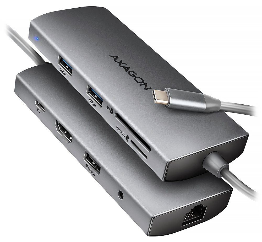 Multiportový USB-C 5Gbps AXAGON HMC-8HLSA hub 9in1 rozšíří Váš notebook, počítač nebo telefon o devět portů. Přes oboustranný USB-C konektor tak snadno a rychle připojíte k počítači monitor, tři USB zařízení, Gigabitovou ethernet síť, sluchátka s mikrofonem a čtečku SD karet současně. Zároveň získáte možnost napájení notebooku pomocí technologie Power Delivery. Replikátor portů Vám tak poskytne jednoduchou a skladnou dokovací stanici 9v1 nejen k Windows notebookům ale i Apple notebookům jako je například MacBook Air nebo MacBook Pro. USB rozbočovač nabízí tři USB výstupy se standardním USB-A konektorem. Dva z nich o rychlosti 5Gbps a jeden s rychlostí 480Mbps pro připojení myši nebo klávesnice. Hub také zvládne trvalé připojení více externích disků současně. Díky rychlému USB 3.2 Gen 1 rozhraní je přenosová rychlost hubu až 5Gb/s. USB-C konektor je vyhrazen pouze pro nabíjení telefonů nebo notebooků pomocí technologie Power Delivery 3.0 výkonem až 100W. Do hubu zapojíte vhodnou USB-C Power Delivery nabíječku a hub připojíte k notebooku s podporou Power Delivery. Tím také uvolníte jeden USB-C port vašeho notebooku. HDMI výstup poskytuje kvalitní obraz v rozlišení až 4K/60Hz Ultra HD a podporuje přenos vícekanálového zvuku. Podporovány jsou také vysoké frekvence v oblíbených hráčských rozlišeních 2K/144Hz nebo FullHD/240Hz. Díky podpoře HDR (vysoce dynamický rozsah) si můžete bez omezení vychutnat výrazně rozšířený rozsah barev a kontrastů. Pro správné fungování video výstupu je nutné, aby notebook měl USB-C port s podporou DisplayPort Alternate Mode (DP Alt Mode) nebo port Thunderbolt 3, 4 a výše. Gigabitová síťová karta rozšíří počítač o rychlé a stabilní síťové připojení, doplní chybějící síťový RJ-45 Ethernet konektor, nebo přidá další síťovou kartu. Čtečka karet podporuje všechny verze SD a microSD karet včetně SDXC a microSDXC s kapacitou až 2TB. Card reader umožňuje současnou práci s kartami v obou slotech a přímé kopírování mezi nimi. Zvukový výstup je vyveden na 3.5 mm jack a umožní připojení stereo sluchátek s mikrofonem. Elegantní hliníkové tělo zajistí nejen mechanickou odolnost, ale i pasivní chlazení. Díky funkcím Plug and Play a Hot Plug je samotné zapojení hubu velmi jednoduché bez složité instalace, a také lze jednoduše připojovat a odpojovat periferie za běhu počítače. Rozbočovač se nezalekne ani připojení k telefonům s USB-C konektorem. K telefonu tak připojíte například flash disk, klávesnici, myš, monitor, TV nebo projektor. Vstup (připojení k notebooku): • USB 5Gbps (USB 3.2 Gen 1 / USB 3.0), konektor USB-C male. • Kompatibilní s USB 3.2 Gen 2, USB4 a Thunderbolt 3/4. Vstup: (napájení): • USB Power Delivery 3.0 - 100W port (jen napájení), konektor USB-C female. • Napájení notebooku ze síťového adaptéru přes USB-C hub. • Napájení PD musí podporovat jak notebook (telefon), tak síťová nabíječka. Výstupy USB: • 2x USB 5Gbps port, konektor USB-A female. • 1x USB 480Mbps port, konektor USB-A female. • USB-C hub zvládne připojení více externích disků současně. Video výstup: • 1x HDMI port, konektor HDMI A female. • 4K rozlišení 4096 x 2160 při až 60Hz. • 2K / WQHD rozlišení 2560 x 1440 při až 120Hz. • FHD rozlišení 1920 x 1080 při až 240Hz. • Podpora výše uvedených max. rozlišení a frekvencí vyžaduje připojení k počítači s DisplayPort verze 1.4. • Pro funkci video výstupu je nutné hub zapojit do USB-C portu s podporou DisplayPort Alternate Mode (DP Alt Mode) nebo do USB-C portu s podporou Thunderbolt 3/4. Dále je nutný vhodný OS. Bez této podpory nebude funkce video výstupu dostupná. • Podpora HDR (High dynamic range, 10 bit support) - realistická reprodukce světlých a tmavých detailů. • Podpora HPD (Hot-Plug-Detect). • Podpora TMDS (Transition Minimized Differential Signaling). • Plná podpora HDCP 1.4 a 2.3 (High-bandwidth Digital Content Protection). • Podpora 2kanálového zvuku vzorkovací frekvence až 192 kHz a až 24bitového zvuku – závisí na zdrojovém a koncovém zařízení, tj. notebooku/telefonu a TV/monitoru/AV receiveru. Výstup RJ-45: • Rozhraní Gigabit Ethernet s RJ-45 konektorem pro připojení UTP, FTP, STP nebo SFTP patch kabelem. • Podporované přenosové rychlosti Ethernet rozhraní 10/100/1000 Mb/s. • Podporované specifikace IEEE 802.3 10Base-T, IEEE 802.3u 100Base-TX, IEEE 802.3ab 1000Base-T. • 10/100/1000 Mb/s autodetekce. • Podpora funkce Wake-on-LAN. Čtečka karet - dva sloty: • Slot Micro SD: microSD / microSDHC / microSDXC / TransFlash. • Slot SD: SecureDigital / SDHC / SDXC, MultiMedia Card, MMC, MMC Dual Voltage, MMC mobile, RS-MMC, s adaptérem - miniSD, microSD / microSDHC / microSDXC, MMC Micro. • Podpora UHS-I. Rychlost až 104 MB/s. Podpora hardware ECC funkce a CRC funkce. • 2 LUN - čtečka se indikuje jako dvě diskové jednotky. Možnost kopírování z karty na kartu. Audio výstup / vstup: • 1x 3.5 mm jack pro headset, sluchátka nebo aktivní reproduktory, • 2kanálový analogový stereo výstup 48 kHz @ 16 bit pro přehrávání, • 1kanálový analogový mono mikrofonní vstup 48 kHz @ 16 bit pro nahrávání. Další vlastnosti: • Možnost připojení zařízení za chodu díky podpoře Hot Plug. • Plná podpora Plug and Play. • Podpora úsporného režimu. • Napájení přes USB sběrnici - USB bus power nebo z PD nabíječky. • Odolné hliníkové tělo pro lepší chlazení hubu. • LED indikuje trvalým svitem připojení hubu k počítači. • Kvalitní stíněný kabel zaručuje vysokou rychlost komunikace a minimální nežádoucí interference. • Rozměry 118 x 46 x 15 mm. • Hmotnost 88 g. • Délka USB-C male kabelu 20 cm. Podporované operační systémy