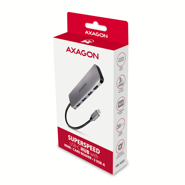 (Registrace)AXAGON HMC-HCR3A, USB 3.2 Gen 1 hub, porty 3x USB-A, HDMI 4k/30Hz, SD/microSD, kabel USB-C 20cm