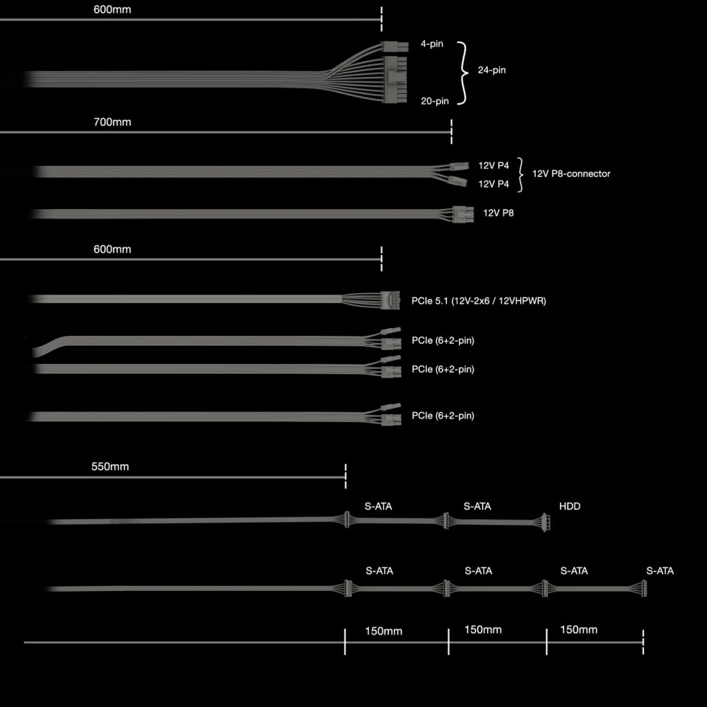 Napájecí konektory: 1× ATX 20+4pin, 1× PCIe 5.1 (600 W), 1× EPS 4+4pin, 1× EPS 8pin, 3× PCIe 6+2pin, 6× SATA, 1× Molex