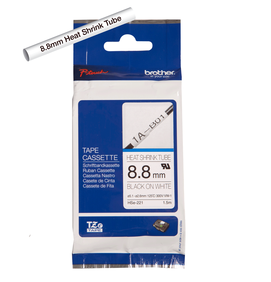 Brother - Originální pásková kazeta s tepelně smršťovací trubičkou, HSE211, černá na bílém podkladu, šířka 8,8 mm
