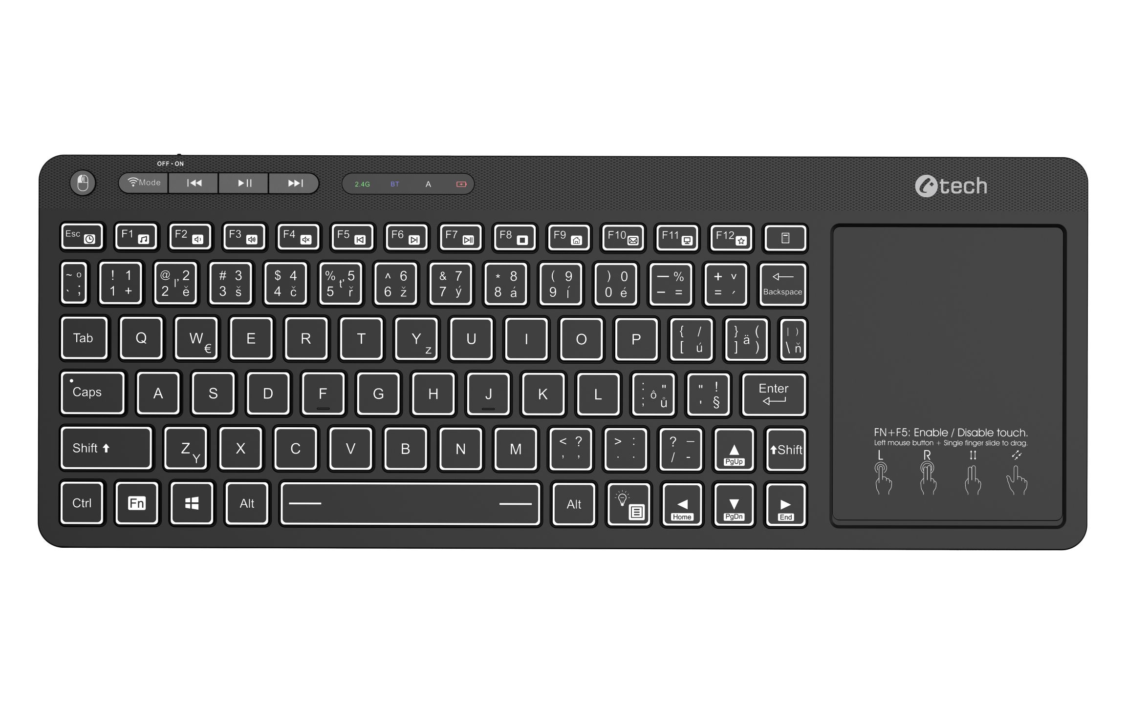 (Registrace)C-TECH klávesnice WLTK-03, Dual mode, BT5.0 + 2,4GHzb, bezdrátová s touchpadem, LED podsvětlení, černá