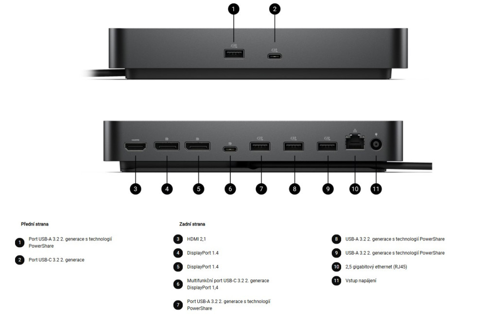 Technické parametry * Technologie připojení: Drátové * Počet podporovaných displejů: 4 * Podporované zařízení: Notebook * Technologie Ethernet: RJ45 Ethernetový port, 1GbE * Napájení USB: 130 W (systémy Dell), 96 W (systémy jiných výrobců než Dell) * Maximální výkon zdroje napájení: 180 W Funkce správy * Správa hostitelského počítače - Předávání MAC adres - Spouštění PXE - Synchronizace tlačítka napájení doku - Probuzení v síti LAN - Přepínač WLAN na LAN - Ochrana přímého přístupu do paměti jádra (DMA) Funkce správy doků - Vzdálené aktualizace firmwaru bez PC - Aktualizace firmwaru na bázi hostitelského PC - Aktualizace firmwaru při odpojení - Zakázání portů nezávislé na PC Rozlišení videa * DP1.4 s kompresí Display Stream 4x WQHD (3440 x 1440) @ 60 Hz 3x WQHD (3440 x 1440) @ 60 Hz 2x 5K (5120 x 2160) @ 60Hz 1x 6K (6144 x 3456) @ 60Hz * DP1.4 bez komprese Display Stream Až k: 4x HD (1280 x 720) @ 60Hz 3x FHD (1920 x 1080) @ 60Hz 2x QHD (2560 x 1440) @ 60Hz 1x 4K (3840 x 2160) @ 60Hz Rozhraní/porty Rozhraní hostitele * Video rozhraní 2x DP1.4 1x HDMI 2.1 1x USB-C 3.2 Gen 2 multifunkční DisplayPort 1.4 * Porty USB (pouze data) 4x USB-A 3.2 Gen 2 (10 Gbps) 1x USB-C 3.2 Gen 2 (10 Gbps) * Porty USB (napájení) 4x USB-A 3.2 Gen 2 (4,5 W každý) 1x USB-C 3.2 Gen 2 (15 W) 1× multifunkční rozhraní USB-C DisplayPort (7,5 W) Všechny dodávají energii s počítačem nebo bez něj Rozměry * Výška: 205mm * Šířka: 90mm * Hloubka: 35,25mm * Hmotnost (přibližná): 562 g Obsah balení Dokovací stanice Napájecí adaptér a napájecí kabel Dokumentace (Příručka pro rychlý start, informace o bezpečnosti, životním prostředí a předpisech) Kompatibilita Dell Plus DB16255 Dell Pro PC14250 Dell Pro PC16250 Dell Pro PC14255 Dell Pro PC14255 Dell Pro Premium PA13250 Dell Pro Premium PA14250 Dell Pro Plus PB13250 Dell Pro Plus PB14250 Dell Pro Plus PB16250 Dell Pro Plus PB13255 Dell Pro Plus PB14255 Dell Pro Plus PB16255 Dell Pro Max MC14250 Dell Pro Max MC16250 Dell Pro Max MC14255 Dell Pro Max MC16255 Dell Pro Rugged RA13250 Dell Pro Rugged RA14250 Inspiron 5441 Inspiron 7441 Latitude 3140 Latitude 3330 Latitude 3340 Latitude 3430 Latitude 3440 Latitude 3445 Chrome Latitude 3450 Latitude 3530 Latitude 3540 Latitude 3550 Latitude 5330 Latitude 5330 2v1 Latitude 5340 Latitude 5340 2v1 Latitude 5350 Latitude 5350 2v1 Latitude 5430 Latitude 5430 Chromebook Enterprise Latitude 5431 Latitude 5440 Latitude 5450 Latitude 5455 Latitude 5530 Latitude 5531 Latitude 5540 Latitude 5550 Latitude 7230 Rugged Latitude 7320 Detachable Latitude 7330 Latitude 7340 Latitude 7340 2v1 Latitude 7350 Latitude 7350 2v1 Latitude 7350 2v1 Detachable Latitude 7430 Latitude 7440 Latitude 7440 2v1 Latitude 7450 Latitude 7450 2v1 Latitude 7455 Latitude 7530 Latitude 7640 Latitude 7650 Latitude 9330 2v1 Latitude 9430 Latitude 9440 2v1 Latitude 9450 2v1 Precision 3470 Precision 3480 Precision 3490 Precision 3570 Precision 3571 Precision 3580 Precision 3581 Precision 3590 Precision 3591 Precision 5470 Precision 5480 Precision 5490 Precision 5570 Precision 5680 Precision 5690 Precision 5770 Precision 7670 Precision 7680 Precision 7770 Precision 7780 XPS 9315 XPS 9315 2v1 XPS 9320 XPS 9340 XPS 9345 XPS 9350 XPS 9440 XPS 9520 XPS 9530 XPS 9720 XPS 9730