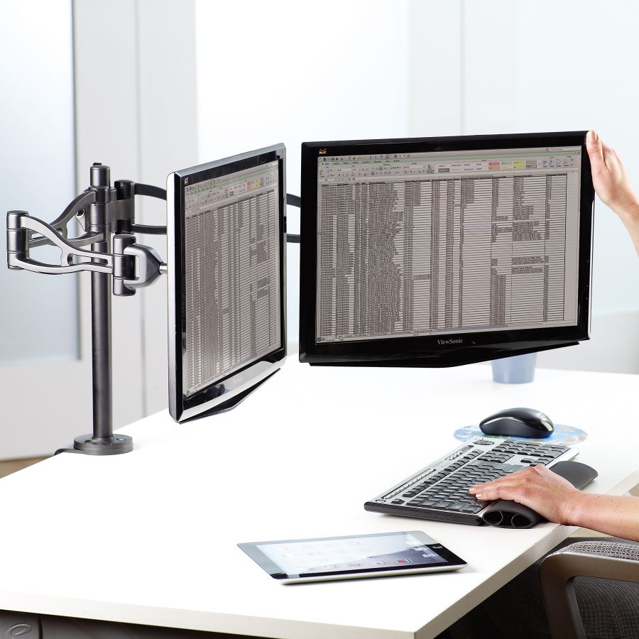 Používáním držáku monitoru Fellowes Profesional předcházíte bolesti šíje a krční páteře. Umožňuje nastavení dvou monitorů na úroveň očí, čím zmírňuje svalové napětí ramen a krku. Vhodné do kanceláře i domácnosti. Určen pro 2 ks LCD / TFT monitorů do velikosti 32" a maximální hmotnosti 10 kg. • pro dva monitory do velikosti 32“, každý o hmotnosti až 10 kg • možnost otáčení až o 360° • nastavitelný náklon +/- 37° • rozsah pohybu od 89 do 419 mm výšky, hloubka posunu od 63 do 686 mm • montážní systém VESA 75 x 75 mm nebo 100 x 100 mm • snadná montáž ke stolu/pultu se sílou desky od 25 mm do 76 mm • montáž na hranu desky nebo do kabelových průchodů s maximální průměrem 82 mm • barva : černá • materiál : kov • hmotnost : 4,4 kg • rozměry (vxšxh) : 559×111×984 mm • doporučen Mezinárodní akademií pro ergonomické produkty FIRA™