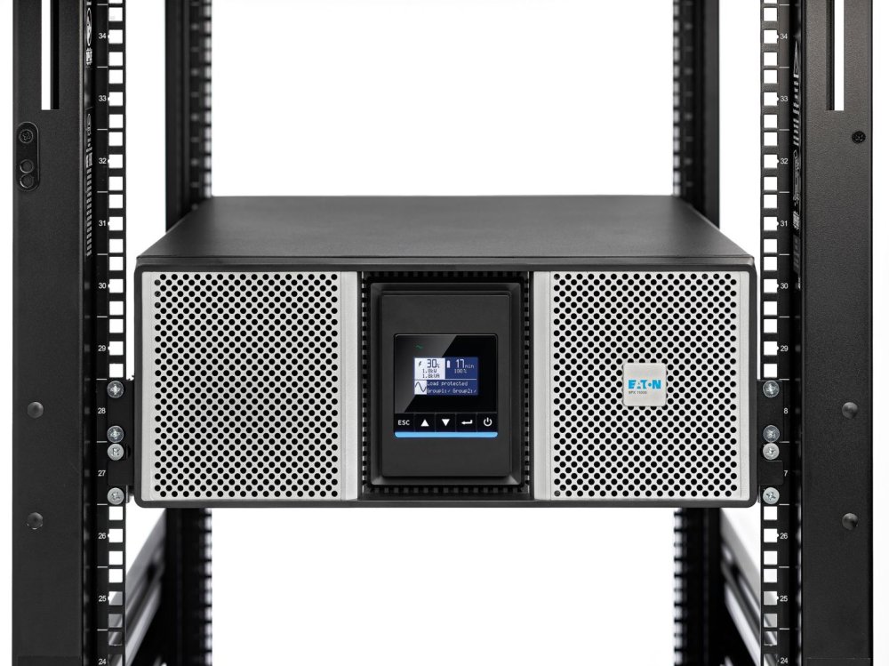 Eaton 9PX Gen2 UPS Netpack, 8000 VA, 8000 W, Input: Hardwired, Outputs: (8) C13, (8) C19, Hardwired, Rack/tower, 4U, Gigabit Network card included, Rack-mounting kit included PARAMETRY Barva: Černá/stříbrná VA rating: 8000 Příkon: 8000 Napětí: 230V Primární frekvence min/max: 40/70 Zásuvka: (8) C13, (8) C39, Hardwired Komunikace: *USB port (HID compliant) *Serial port (RS232) *Mini terminal block for remote On/Off *Mini-terminal block for remote power off *Mini-terminal block for dry contacts outputs (2 contacts) *Network card Uživatelské rozhraní: Multilingual graphical LCD display BATERIE Typ baterie: Sealed, lead-acid FYZICKÉ Maximální výška [cm]: 17,4 Maximální šířka [cm]: 44 Maximální hloubka [cm]: 72,4 Čistá hmotnost [kg]: 78,8 Barva: Černá/stříbrná Záruka: 3 roky na elektroniku, 2 roky na baterii Odkaz na web výrobce: https://www.eaton.com/cz/cs-cz/skuPage.9PX8KIRTNG2.html