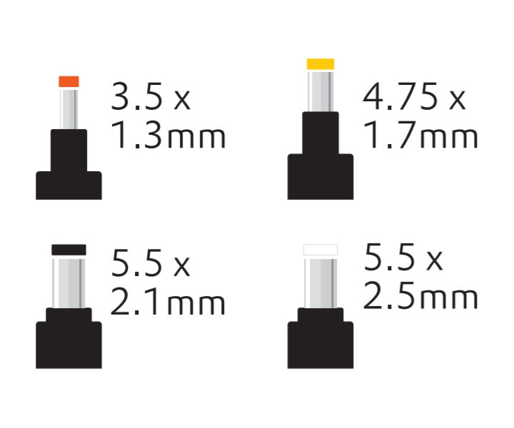 Výstupní zásuvky/konektory: 5,5 × 2,5 mm; 5,5 × 2,1 mm; 4,75 × 1,7 mm; 3,5 × 1,35 mm