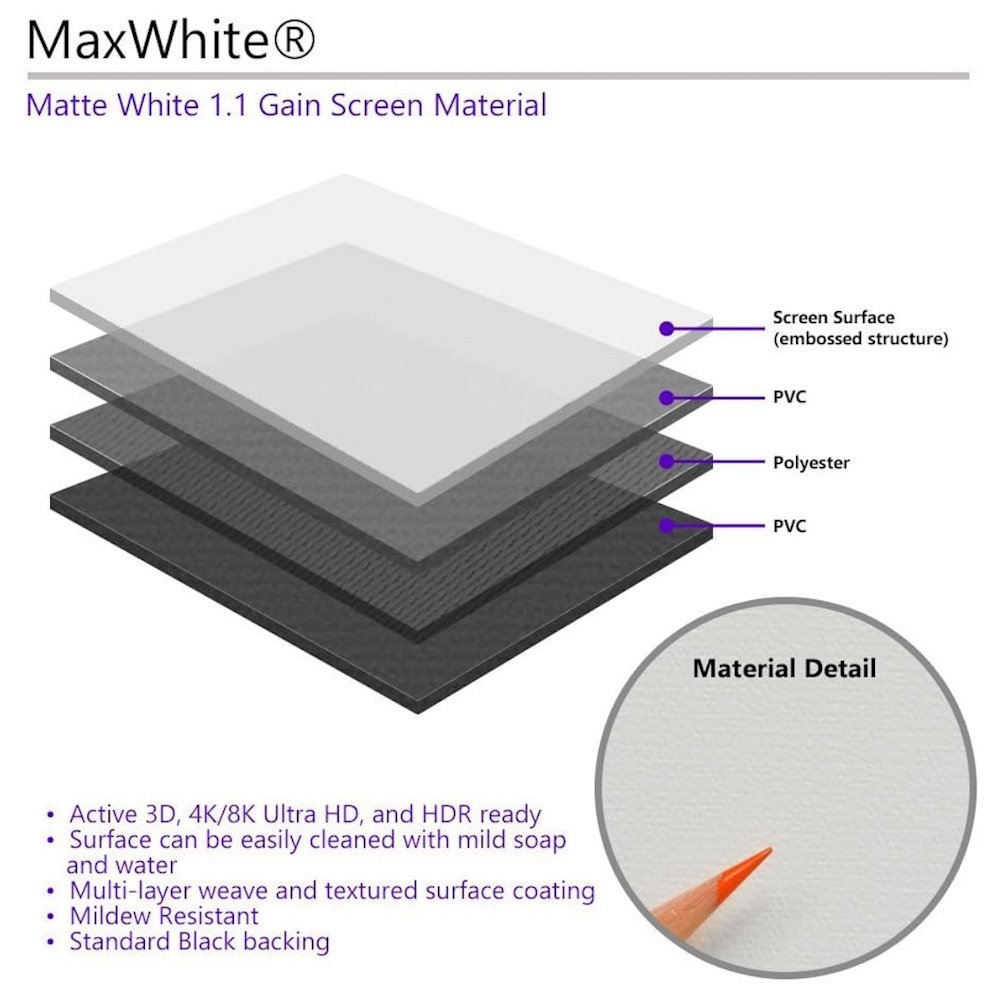 MaxWhite je nejuniverzálnější povrch plátna pro přední projekci prezentace. Tento materiál poskytuje široký pozorovací úhel, perfektní rovnoměrnost rozptylu, jasný obraz a skvělou reprodukci barev.