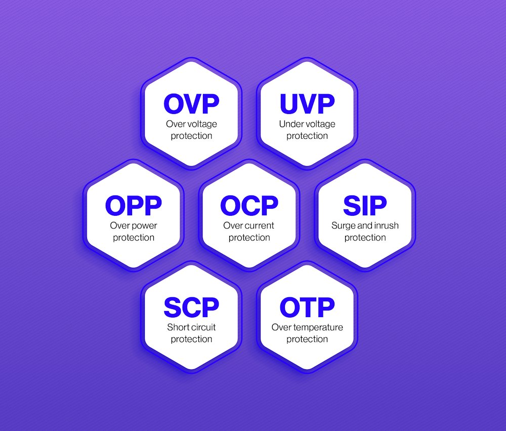 Zdroj obsahuje kompletní sadu elektrických a tepelných ochran včetně ochrany proti přetížení (OVP), podpětí (UVP), nadproudu (OCP), zkratu (SCP), přetížení (OPP), zapínacímu proudu (SIP) a přehřátí (OTP). Tyto prvky zajišťují maximální bezpečnost připojených komponentů.