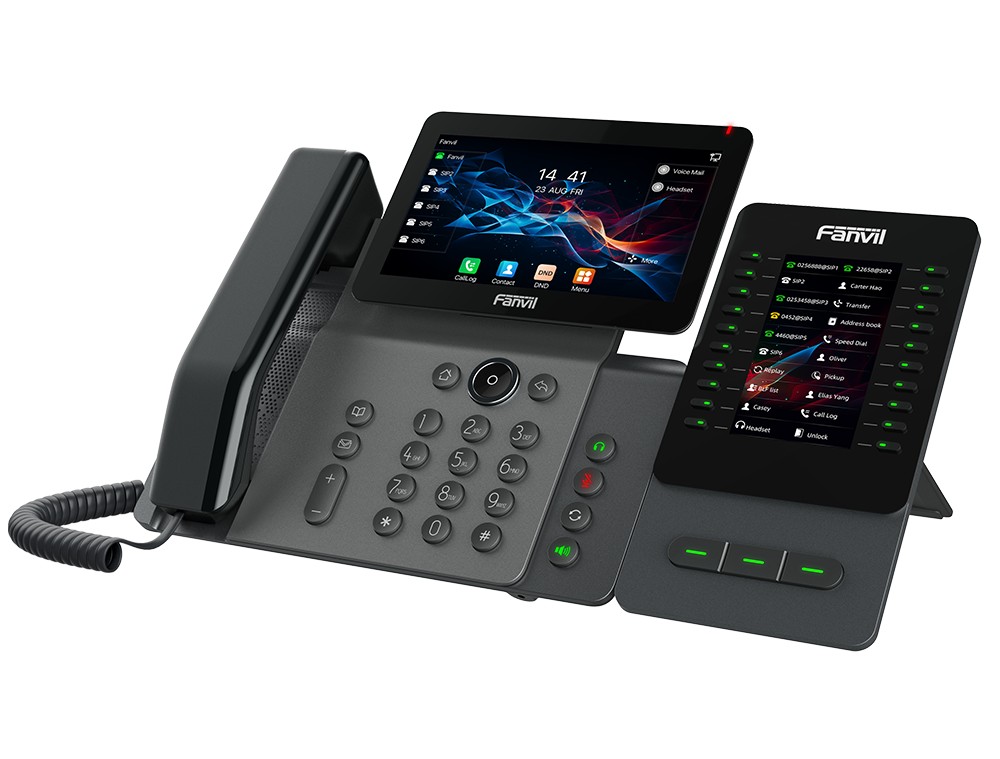 Fanvil EM60 je multifunkční rozšiřující modul s barevným displejem, který lze použít jako příslušenství s telefony V65/V66/V66 Pro a pomáhá zaneprázdněným uživatelům snadno zvládat velký objem hovorů. Je vybaven 4,3palcovým barevným displejem a podporuje 60 programovatelných kláves, z nichž každá je vybavena dvoubarevným LED indikátorem. Po připojení ke kompatibilnímu telefonu umožňuje funkce, jako je rychlá volba, přesměrování hovoru, podržení hovoru a zobrazení stavu BLF, což pomáhá efektivně spravovat velký objem hovorů a zvyšovat produktivitu kanceláře.
