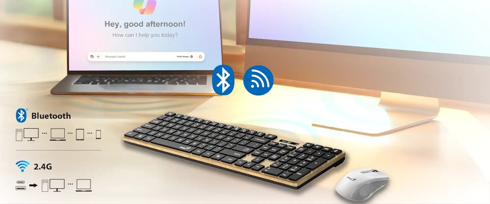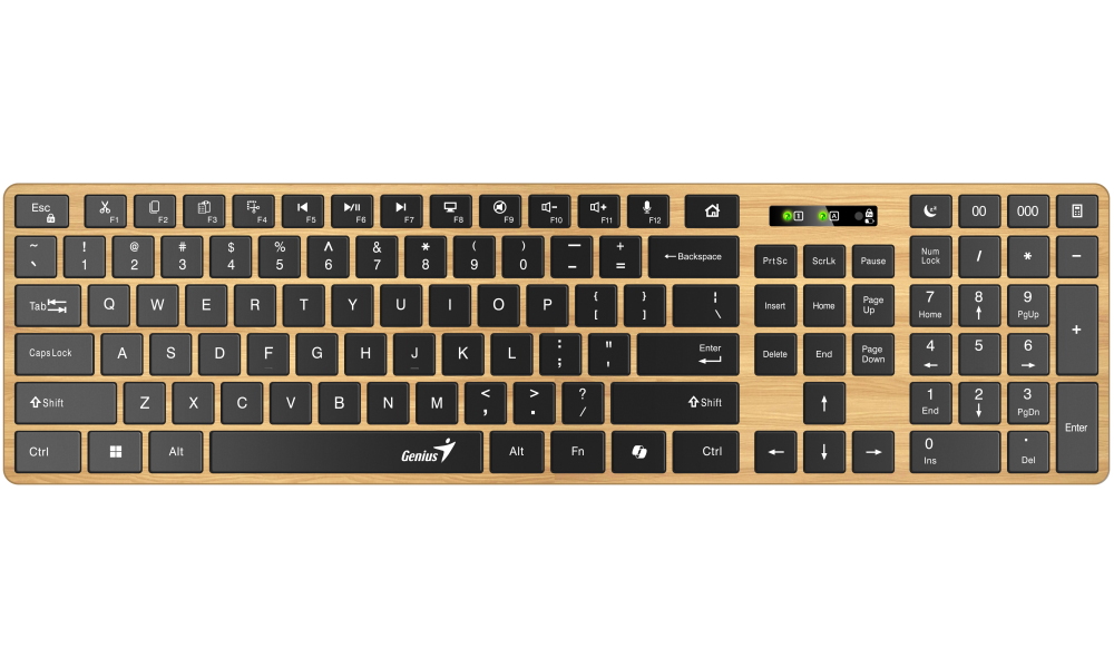 Genius SlimStar 7250BT představuje moderní bezdrátovou klávesnici s elegantním designem inspirovaným severským borovým dřevem. Nabízí duální připojení prostřednictvím Bluetooth 5.0 nebo 2,4GHz bezdrátové technologie s dosahem až 10 metrů. Klávesnice je ideální pro širokou škálu zařízení včetně stolních počítačů, notebooků, mobilních telefonů, tabletů i chytrých televizorů.