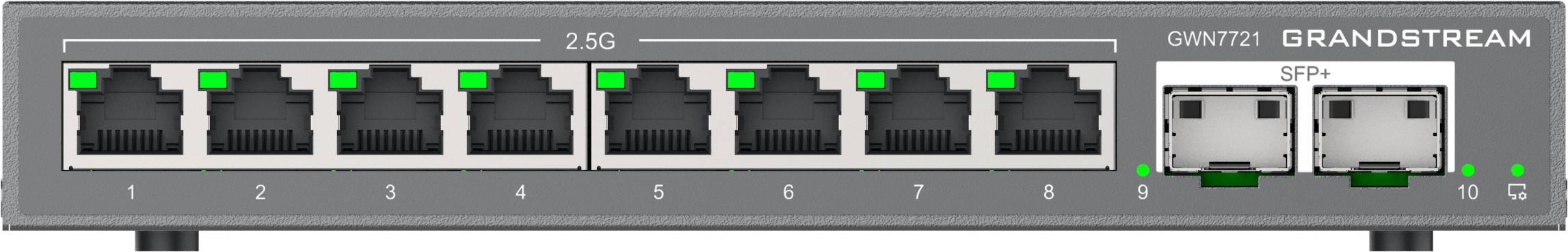 GWN7721 je 10portový managovatelný switch L2 Lite, vybavený 8x 2,5G ethernetovými porty a 2x 10gigabitovými SFP+ porty, vhodný pro malé a střední podniky pro budování škálovatelných, bezpečných a inteligentních sítí.