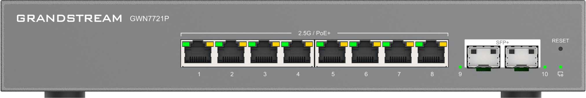 GWN7721P je 10portový managovatelný switch L2 Lite, vybavený 8x 2,5G ethernetovými porty a 2x 10gigabitovými SFP+ porty, vhodný pro malé a střední podniky pro budování škálovatelných, bezpečných a inteligentních sítí.