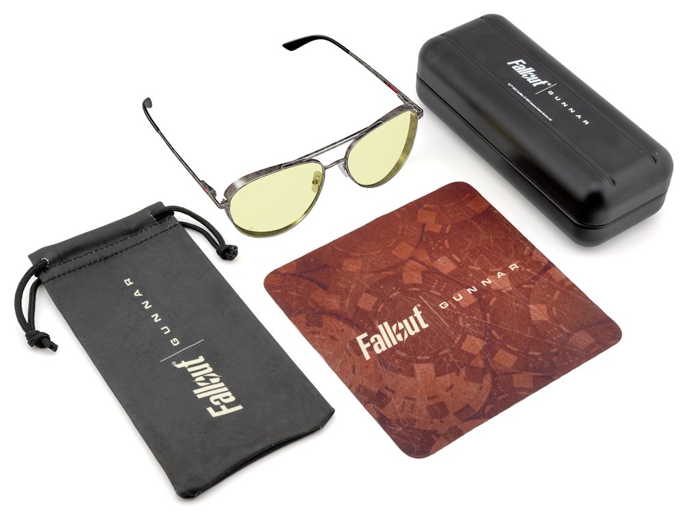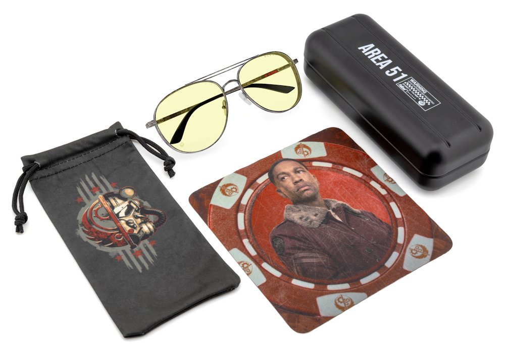 Každé brýle jsou dodávány s kolekcí exkluzivního příslušenství včetně kovového pouzdra „Area 51“, mikrovláknového pouzdra s motivy Brotherhood a čisticího hadříku s designem Fallout.