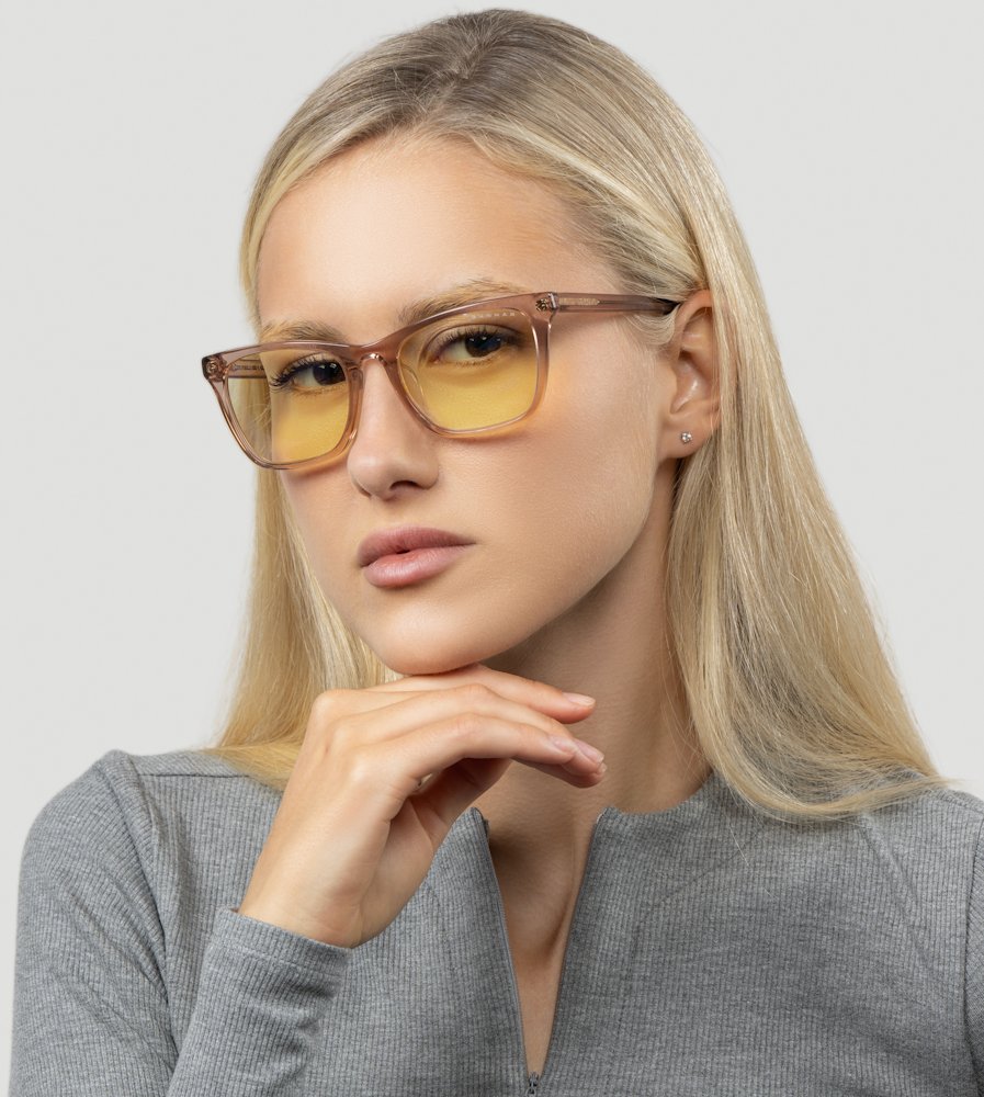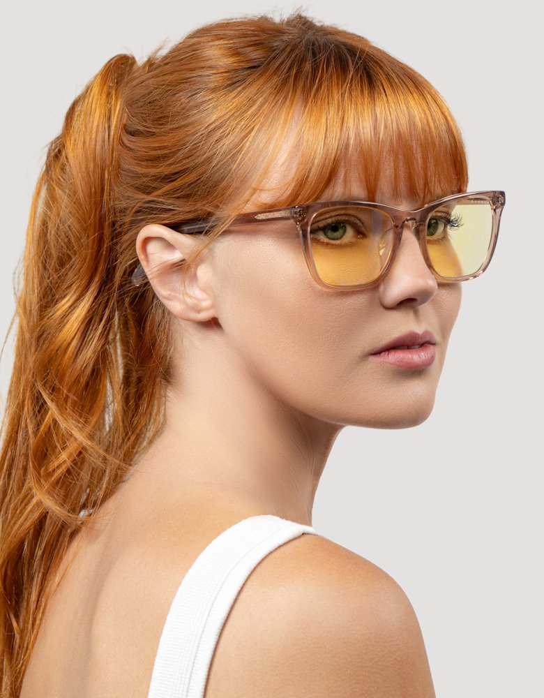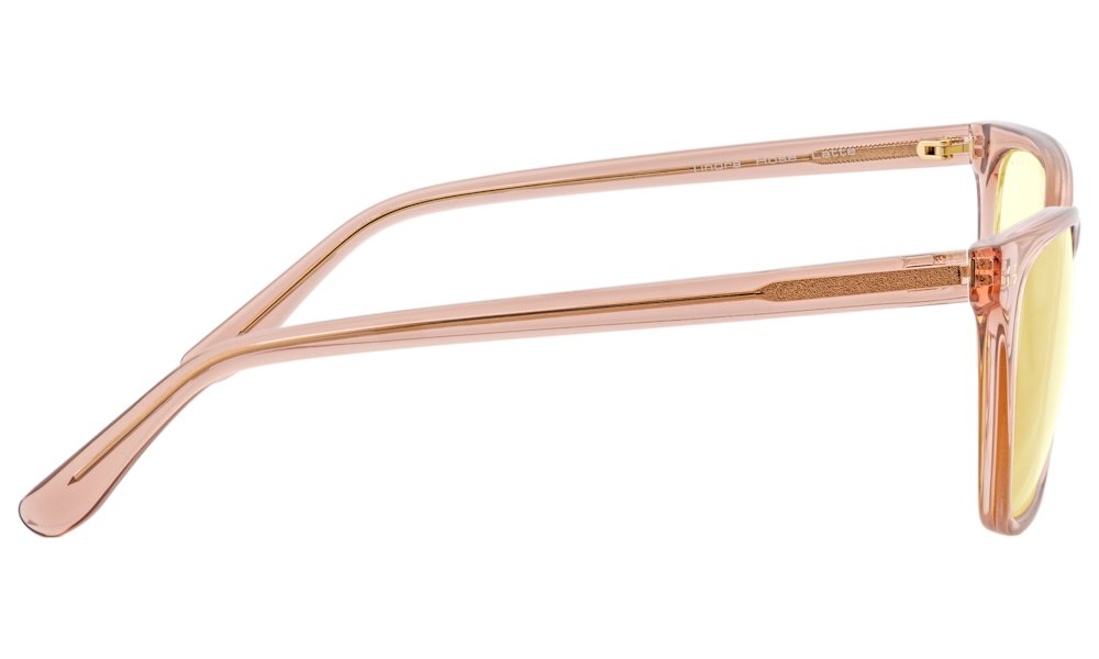 Model Tindra z kolekce Kista inspirované nordickými technologickými centry kombinuje elegantní obdélníkový design s praktickou funkcí dioptrických brýlí. Brýle jsou vyrobeny z prémiového polymeru v atraktivním provedení Rose Latte a osazeny jantarovými čočkami s dioptriemi +2,5.