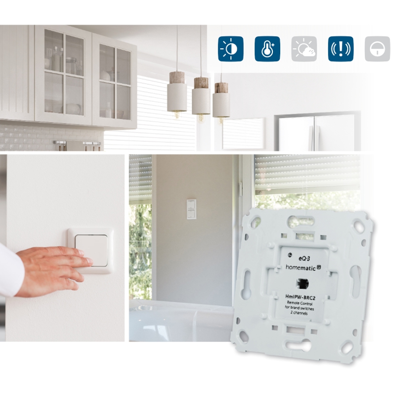 Po montáži a připojení k drátové sběrnici může být současně ovládáno několik akčních členů a systémových funkcí Homematic IP jedním stisknutím tlačítka na běžném kolébkovém vypínači. Například lze naráz zhasnout všechna světla nebo spustit všechny rolety.