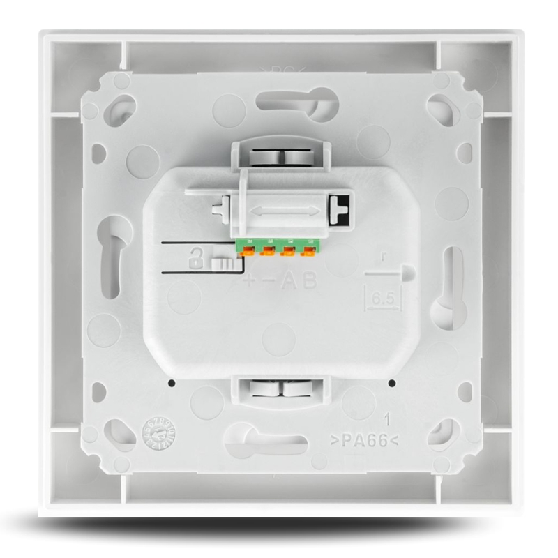 Dodávaná montážní deska je optimalizována pro snadnou montáž v zápustné krabici. Odnímatelná push-in svorka usnadňuje připojení k drátové sběrnici.