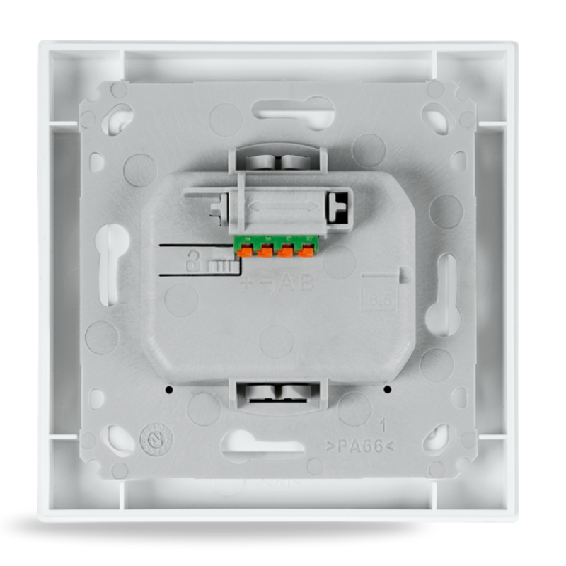 Dodávaná montážní deska je optimalizována pro snadnou montáž v zápustné krabici. Odnímatelná push-in svorka usnadňuje připojení k drátové sběrnici.