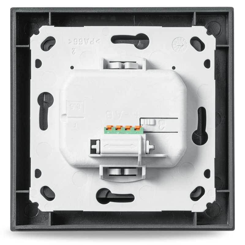 Dodávaná montážní deska je optimalizována pro snadnou montáž v zápustné krabici. Odnímatelná push-in svorka usnadňuje připojení k drátové sběrnici.