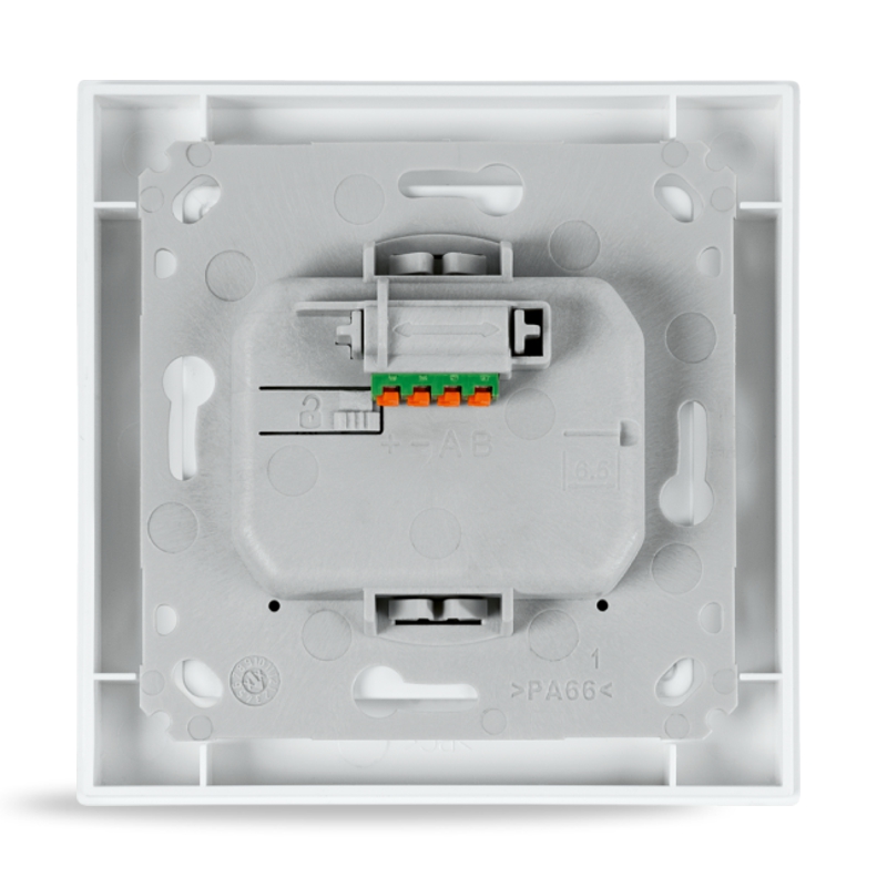 Dodávaná montážní deska je optimalizována pro snadnou montáž v zápustné krabici. Odnímatelná push-in svorka usnadňuje připojení k drátové sběrnici.
