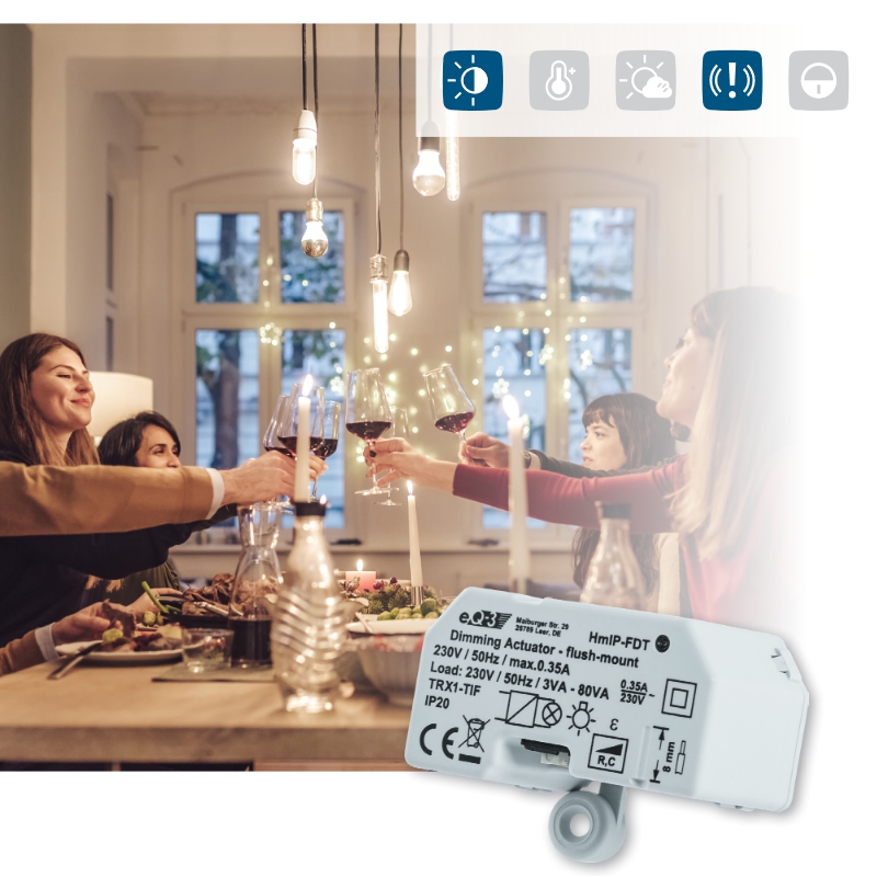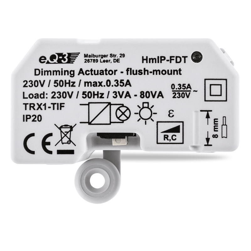 Stmívací akční člen (HmIP-FDT) se montuje do standardní zápustné krabice pod omítku nebo do krabice pro povrchovou montáž s připojením do sítě 230 V. Bezdrátová komunikace nabízí možnost instalace bez potřeby druhotné kabeláže. To znamená, že akční člen lze umístit v místě připraveného nebo stávajícího elektrického rozvodu sítě 230 V.