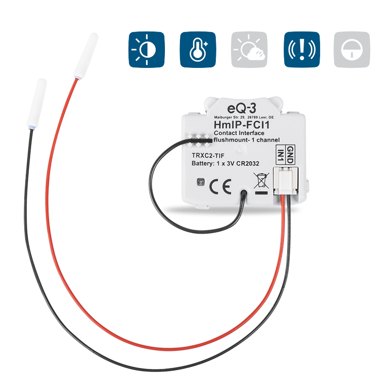 Kontaktní senzor (HmIP-FCI1) umožňuje nekomplikovanou integraci běžných spínačů, vypínačů, tlačítek, kontaktů a dalších periferií do systému chytré domácnosti Homematic IP a díky bateriovému napájení a bezdrátové komunikaci není nikterak závislé na síťovém napájení a nevyžaduje žádnou další kabeláž.