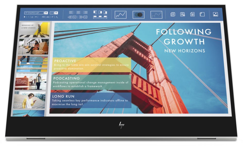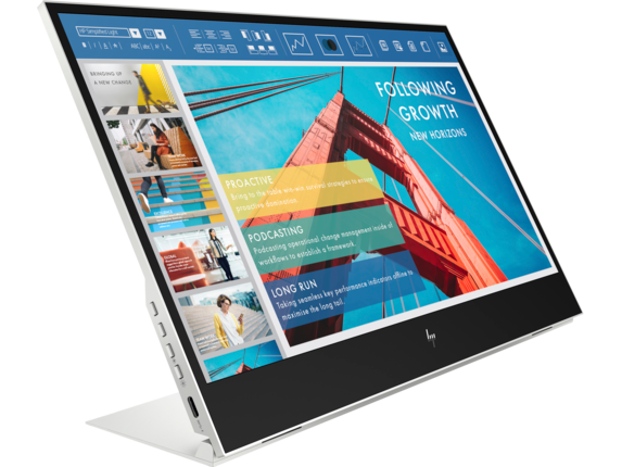 Přenosný monitor HP E14 G4 Cestovní monitor stvořený pro práci v jakýchkoli světelných podmínkách Zaměřte se na produktivitu s přenosným monitorem HP E14 G4. Stačí se připojit jedním kabelem USB-C a můžete si užívat skvělý, mimořádně jasný obraz, ať jste uvnitř nebo venku. * flicker-free, low blue light Typ obrazovky: IPS Podsvícení: w/LED micro-edge Úhlopříčka [palce]: 14" Rozlišení: FHD (1 920 x 1 080) Rozteč bodu [mm]: 0,161 mm Poměr stran: 16:9 Povrch displeje: Antireflexní filtr, 3H Jas [cd/m2]: 400 Kontrast: 800:1 Odezva [ms]: 5 ms Pozorovací úhly (Horizontál/Vertikál): 178/ 178 Reproduktory: Ne Konektory: 2x SuperSpeed USB Type-C s přenosovou rychlostí signálu 5 Gb/s (Alt Mode DisplayPort™ 1.2) Napájení: Napájení 5 V Spotřeba [W]: 7,5 W (maximální), 6 W (typická), 0,3 W (pohotovostní režim) Montáž na zeď: Není kompatibilní s držáky VESA Naklápění monitoru: 0 až + 78 ° Rozměry (S PODSTAVCEM, Š X H X V): 32,14 x 1,52 x 21 cm Hmotnost [kg]: 0,64 kg Obsah balení: Monitor; Dokumentace; Kabel USB Type C; Leták rychlé instalace; Obal Záruka: 36 měs.