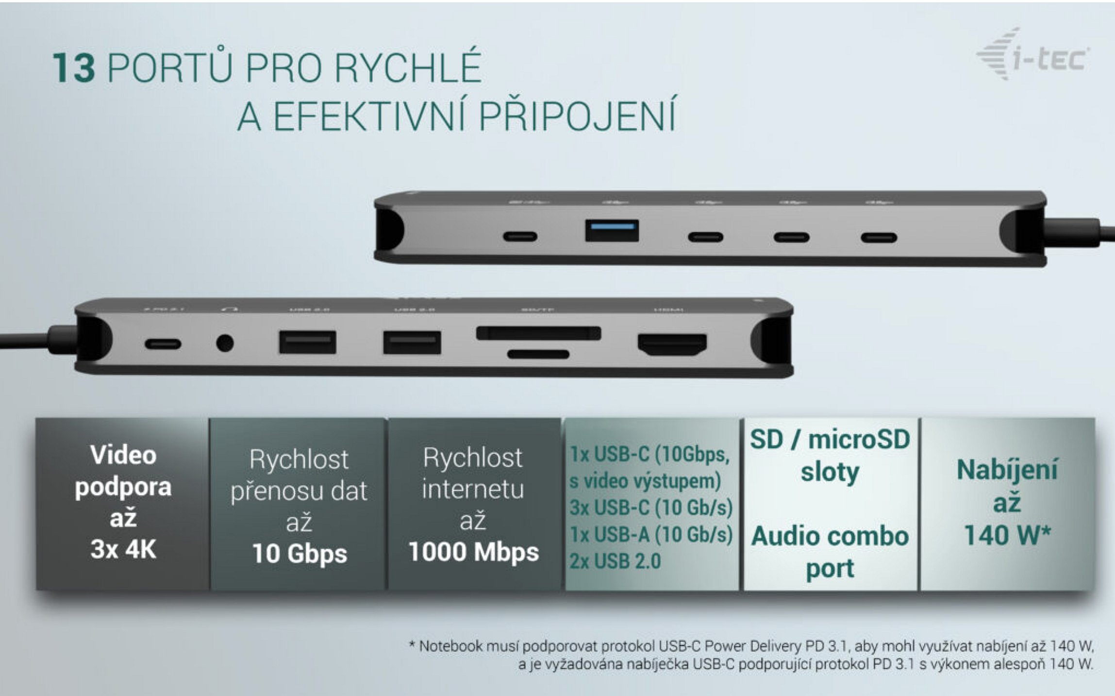 (Registrace)i-tec USB-C Metal Nano 3x Display Dock, 2x HDMI 1x USB-C video, Power Delivery 140W