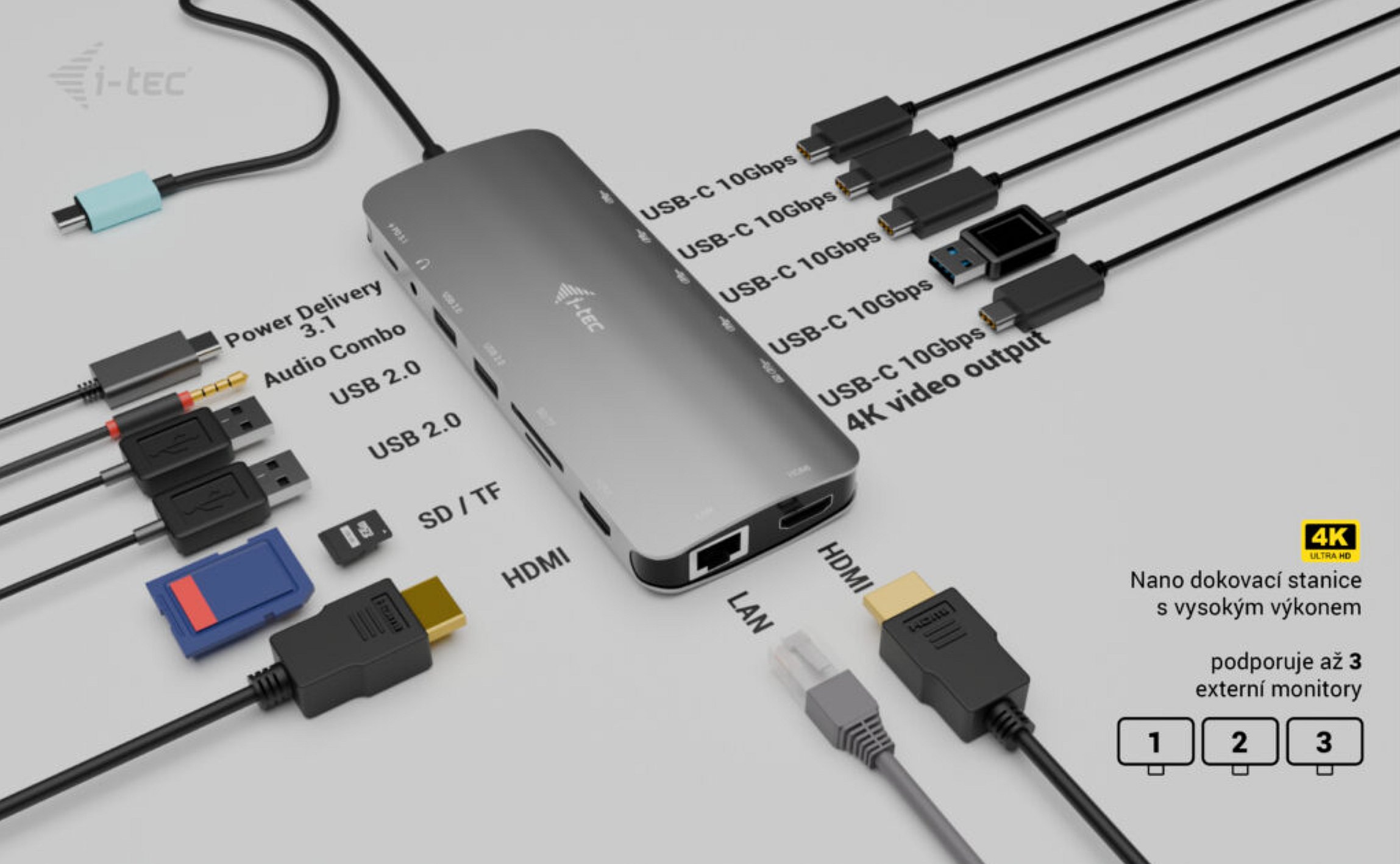 Malá, ale velmi výkonná kovová dokovací stanice USB-C schopná podporovat až tři externí monitory současně*. Stačí připojit notebook nebo tablet (není třeba instalovat ovladače) a můžete využívat výhod rychlého přenosu dat přes USB, připojení k internet...Více info