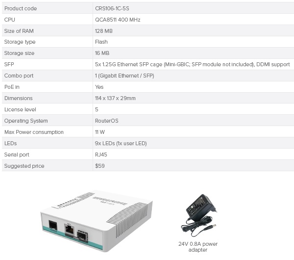 CRS106-1C-5S je malý smart switch vybavený jedním Gbit Ethernet/SFP portem a pěti 1.25Gbps SFP sloty. Switch je vybaven 400MHz procesorem, 128MB RAM a RouterOS L5 licencí. CRS106-1C-5S je řešení pro připojení až šesti zařízení s SFP rozhraním. Technick...Více info