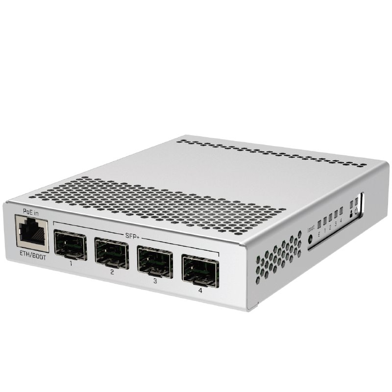 CRS305-1G-4S+IN je kompaktní, přesto velmi výkonný switch, který má čtyři SFP+ porty s rychlostí 10 Gbps/port. Zařízení má také kromě optických portů i jeden Gigabitový ethernet s podporou POE IN pro snadný přístup k zařízení, konfiguraci zařízení nebo jako převod na metalické vedení. K napájení slouží hned dva DC konektory pro redundanci napájení. Switch je velmi elegantní, kompaktní a jeho kovové pouzdro bez ventilátorů zajišťuje tichý provoz.