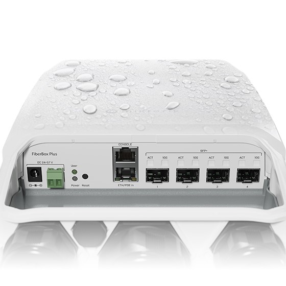FiberBox Plus je ideální volbou pro 10Gigabitové venkovní sítě. Obsahuje moderní procesor ARM, čtyři 10Gigabitové SFP+ porty. Samozřejmostí je také Gigabitový ethernetový port pro správu nebo PoE-in. Nechybí ani switch-chip Marvell 98DX226S.