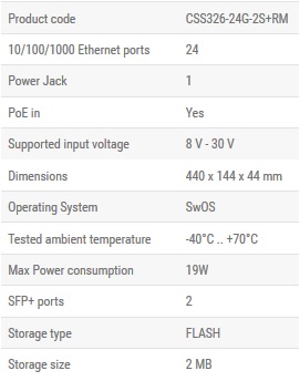 CSS326-24G-2S+RM cloud switch vybavený 24x Gbit ethernet porty, 2x SFP+ a systémem SwOS. SwOS poskytuje základní možnosti nastavení smart switche a několik pokročilých funkcí jako port-port forwarding, MAC filtr, sítě VLAN, omezování přenosové rychlost...Více info