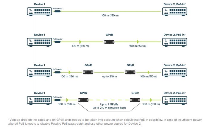 GPER umožňuje rozšířit ethernetový kabel o další hop ( <100-150 m na běžné síťové zařízení a až 210 m na další jednotku GPeR) do 1 500 m.