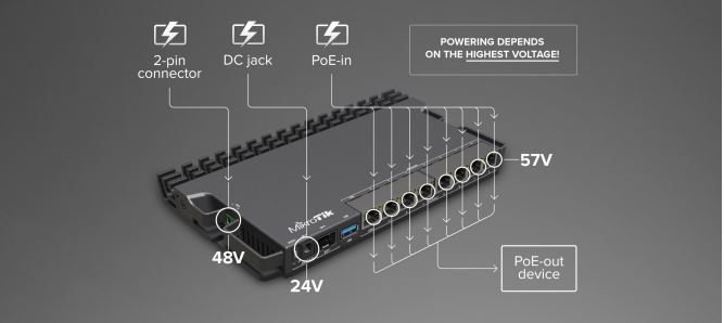 Jednotka RB5009UPr+S+IN je vysoce výkonný router značky Mikrotik, ideální pro malé a střední firmy. Samozřejmostí je 9 kabelových portů, USB port 3.0, 1 G a 2,5 G Ethernet a 10G SFP+. Novinkou je PoE-in a PoE-out na všech ethernetových portech. V kombinaci s 2-pin konektorem a DC jackem získáte 10 samostatných možností napájení. Všechny způsoby napájení podporují široký rozsah napětí 24 - 57 V.