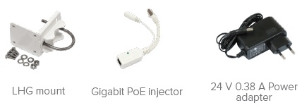 Balení obsahuje 2 spárovaná zařízení, napájecí adaptéry, POE injektory, a montážní sady pro obě jednotky.