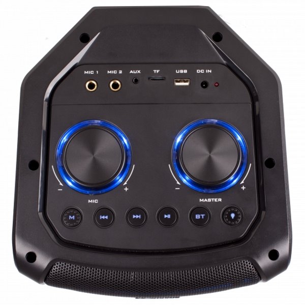Párty reproduktor s výkonem 450 W a barevným LED podsvícením. Hudbu lze přehrávat jak drátově skrze AUX vstup, tak i bezdrátově pomocí technologie Bluetooth. Pro rychlé přehrávání z paměťových médií je přítomen USB port a čtečka microSD karet. Pokud si párty chcete opravdu užít, můžete využít také dva vstupy pro mikrofon. V balení se mikrofon nachází, reproduktor je proto vhodný i pro karaoke. Díky vestavěné baterii lze přehrávat hudbu až 4 hodiny bez nutnosti připojení na elektrickou síť.