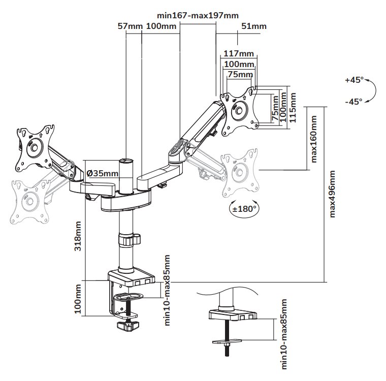 Flexibilní stolní VESA držák pro 2 ploché LCD monitory o velikosti 17" až 27" a hmotnosti do 14 kg (2× 7 kg). Univerzální technologie naklápění, otáčení a natáčení umožňuje optimální nastavení.