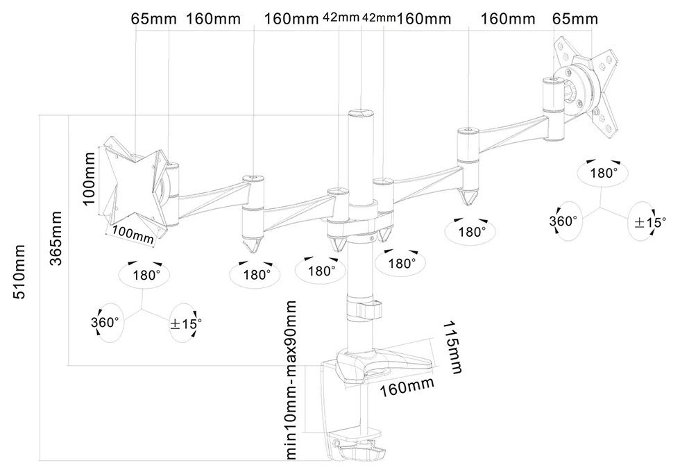 Flexibilní stolní VESA držák pro 2 ploché LCD monitory o velikosti 10" až 27" a maximální nosnosti do 18 kg (2× 9 kg). Univerzální technologie naklápění, otáčení a rotace umožňuje optimální nastavení. Veškerý instalační materiál je součástí výrobku.