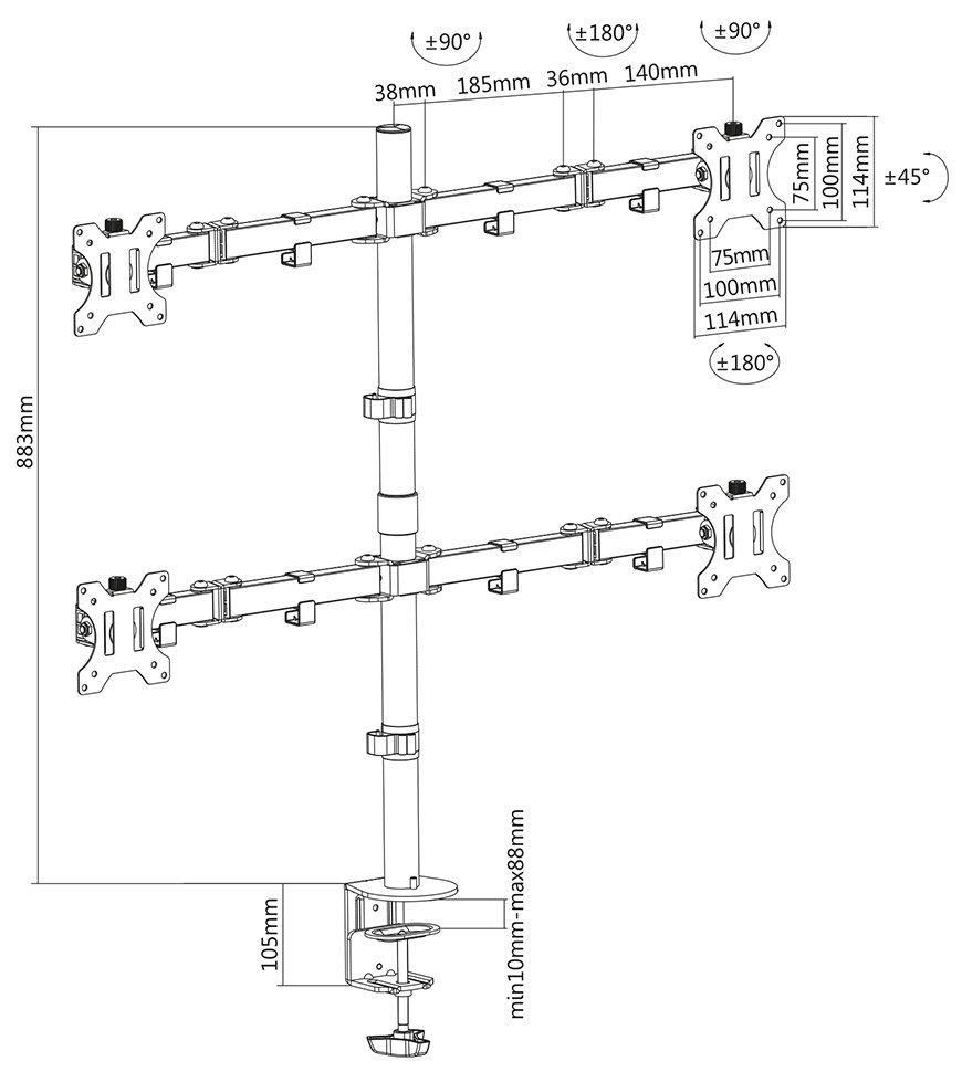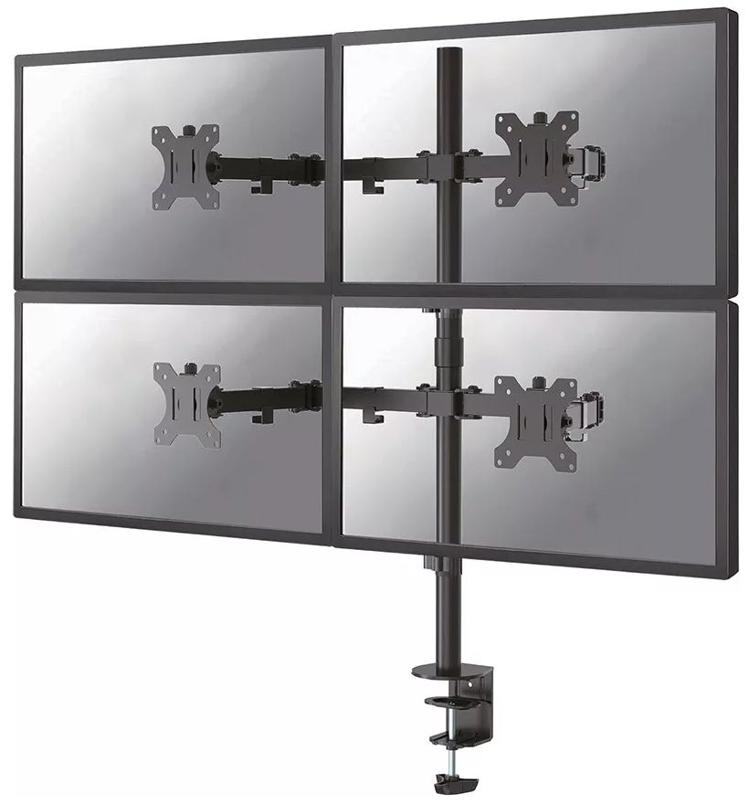 Flexibilní stolní VESA držák pro 4 ploché LCD monitory o velikosti 13" až 32" a nosnosti do 24 kg (4× 6 kg). Držák je možné manuálně zvýšit až do 85,7 cm a nastavit hloubku do 38,2 cm. Je vhodný pro obrazovky, které splňují vzor otvorů VESA 75 × 75 nebo 100 × 100 mm.
