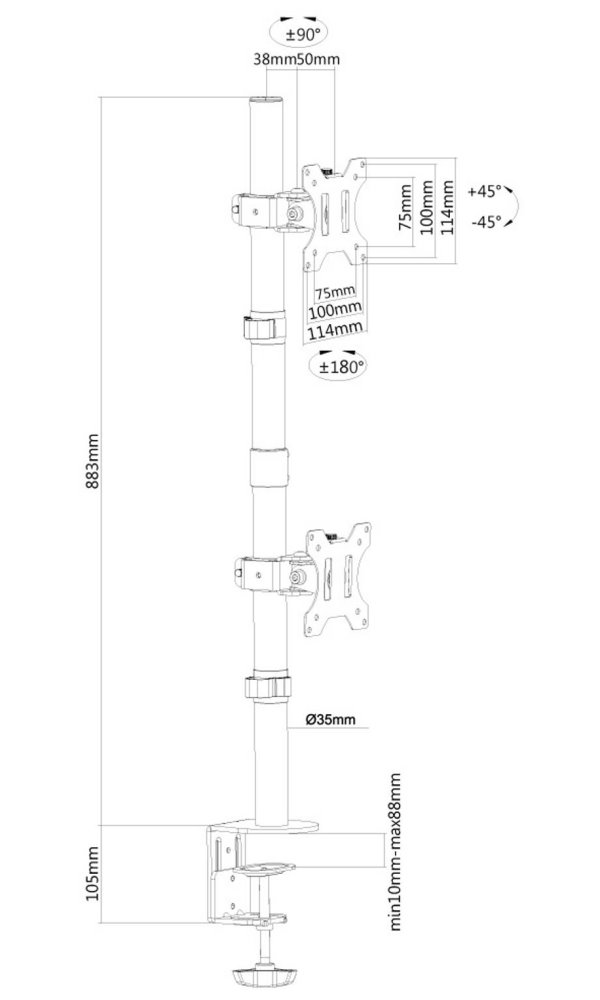 Flexibilní stolní VESA držák pro 2 ploché LCD monitory nad sebou o velikosti 10" až 32" a nosnosti do 12 kg (2x 6 kg). Držák je vhodný pro obrazovky, které splňují vzor otvorů VESA 75 × 75 nebo 100 × 100 mm. Různé vzory otvorů lze pokrýt pomocí VESA adaptérů. Veškerý instalační materiál je součástí výrobku.