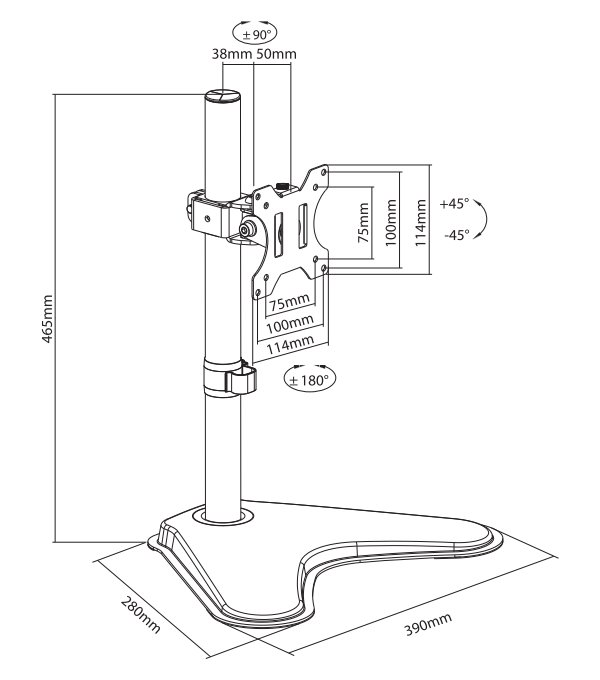 Stolní VESA držák pro plochý LCD monitor o velikosti 13" až 32" a hmotnosti do 8 kg. Držák je manuálně výškově nastavitelný v rozmezí od 5,6 do 41,9 cm. Tento stolní držák je vhodný pro obrazovky, které splňují vzor otvorů VESA 75 × 75 nebo 100 × 100 mm. Různé vzory otvorů lze pokrýt pomocí VESA adaptérů. Veškerý instalační materiál je součástí výrobku.