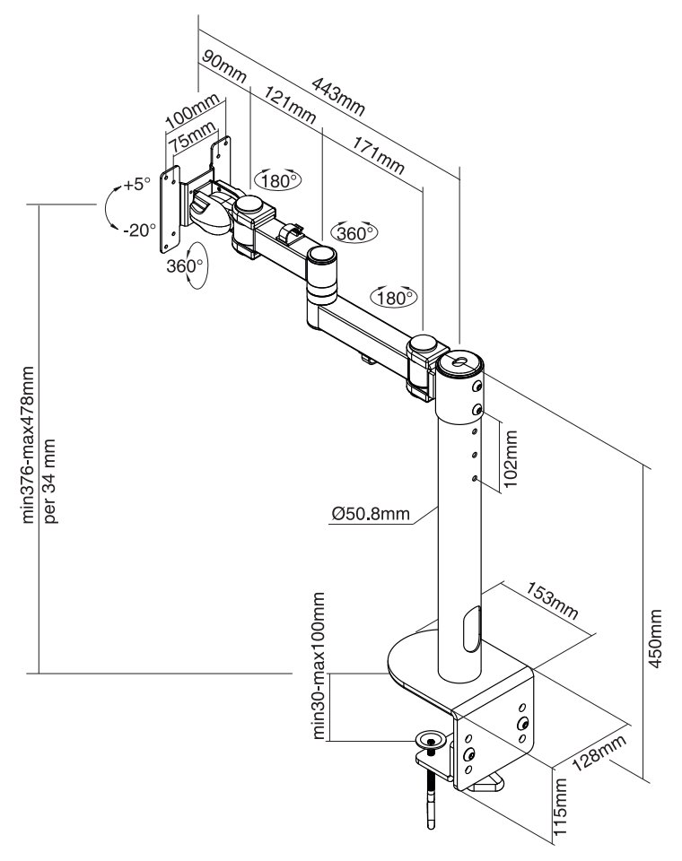 Flexibilní stolní VESA držák pro zakřivené LCD monitory o velikosti 10" až 49" a hmotnosti do 20 kg. Je vybaven zesílenou hlavou pro zakřivené obrazovky a navržen tak, aby podporoval vyšší zatížení. Univerzální technologie naklápění, otáčení a natáčení umožňuje optimální nastavení. Veškerý instalační materiál je součástí výrobku.