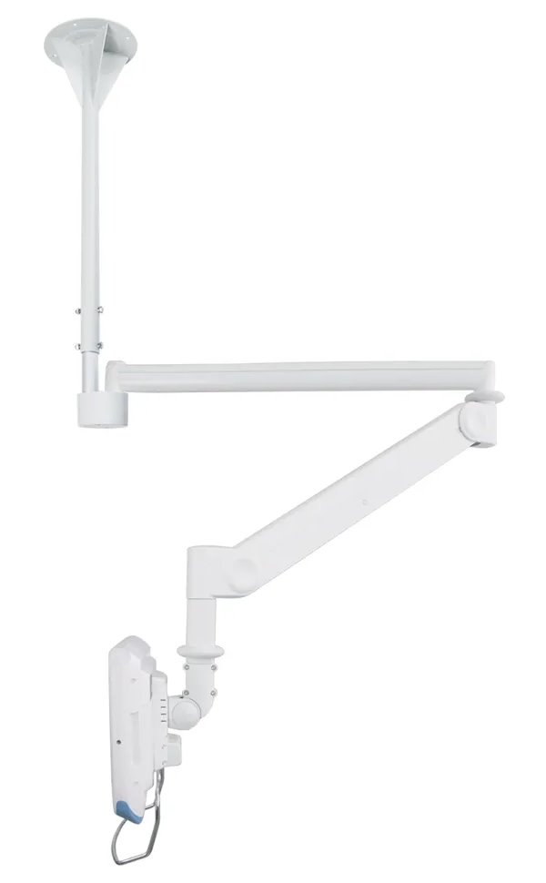 Naklápěcí a otočný stropní držák pro lékařské obrazovky s úhlopříčkou 10" až 24" a hmotností až 6 kg. Je kompatibilní s obrazovkami se vzorem otvorů VESA 75 × 75 a 100 × 100 mm.